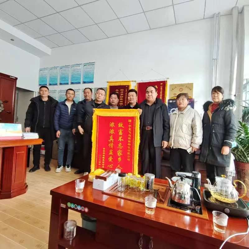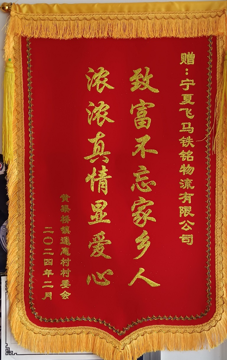2024年2月26日,平罗县通惠村两委领导带领各生产队队长到宁夏飞马铁铭物流有限公司,为公司送来了一面旌旗,“浓浓真情显爱心,致富不忘家乡人”。自2018年开始,宁夏飞马铁铭物流有限公司累计捐献资金36.9万元,包括捐资助学,送温暖,灾区捐助,扶贫帮困,探望鳏寡孤独老人等,受到了社会各界的广泛好评。